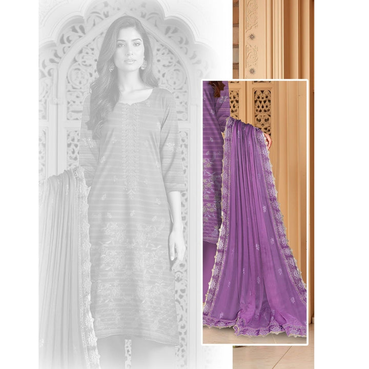 Bana Dora Luxury Viscose embroidered shirt, paired with an elegant fancy super shawl and complemented by a plain dyed viscose trouser. This ensemble combines refined craftsmanship with premium fabrics for a sophisticated look.